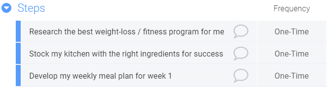 Using the Wellbeing and Lose 10 lbs example from above, some examples of Steps include: