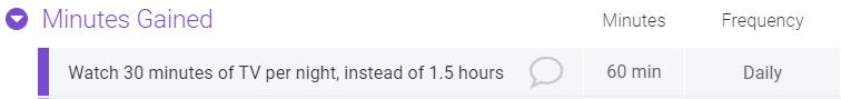 Minutes Gained include time you gain by eliminating or refocusing time you spent on habits and activities that aren't in line or maybe even work against you achieving your Goals.