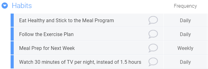 Again, using the Wellbeing and Lose 10 lbs example from above, some examples of Habits include: